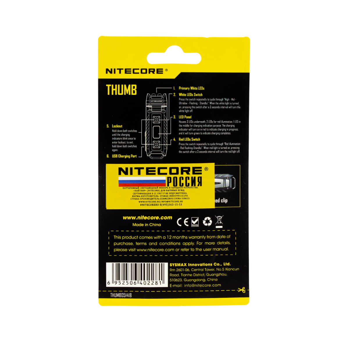 Помимо парных светодиодов белого света Nitecore THUMB также имеет светодиод красного цвета, расположенный на корпусе, который может использоваться как для освещения (в качестве «маяка»), так и для индикации уровня заряда аккумулятора.