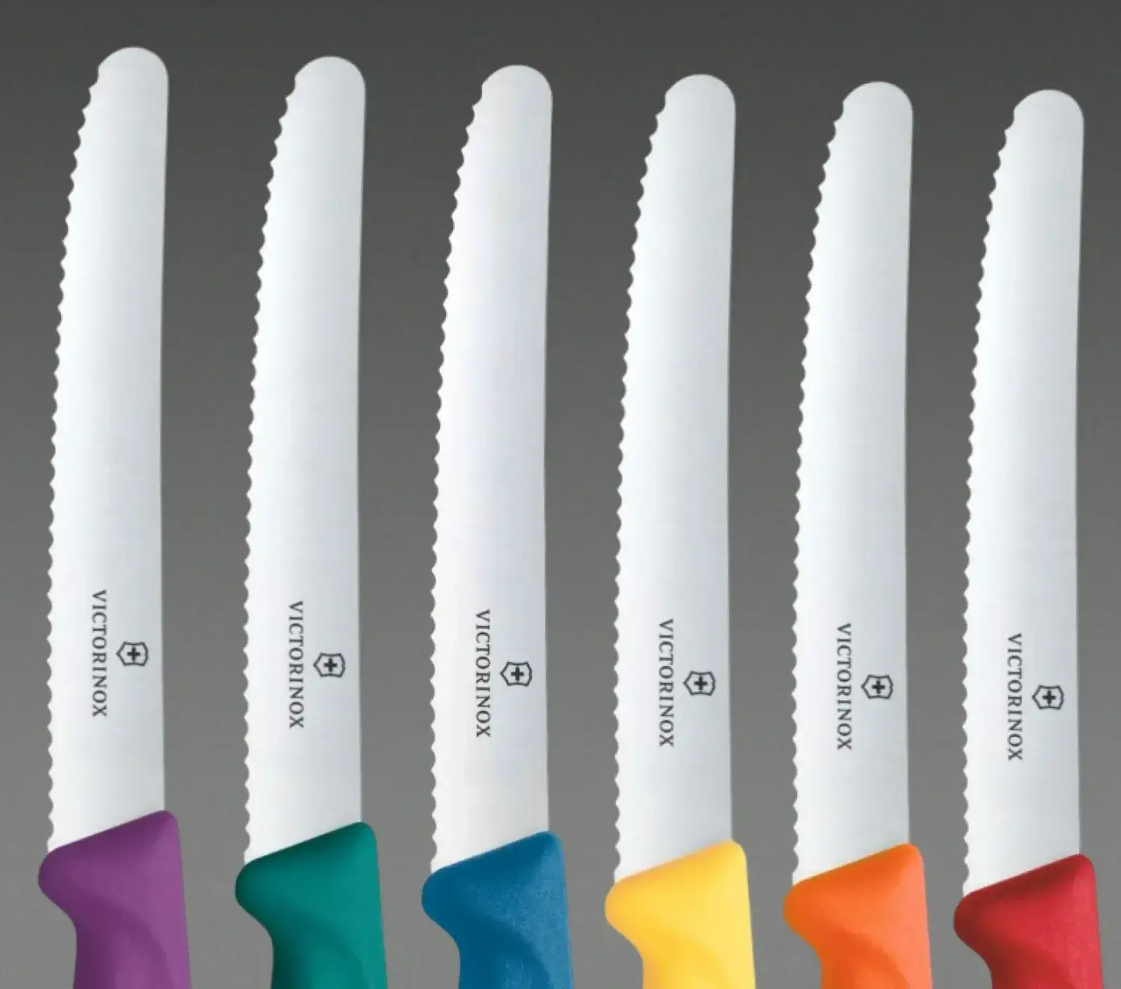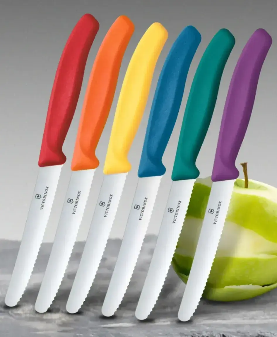 Универсальные швейцарские кухонные ножи Victorinox с 11-сантиметровым зубчатым лезвием идеально подходят для нарезки овощей, фруктов, сосисок, колбас, стейков, небольших кусков мяса и кондитерских изделий.