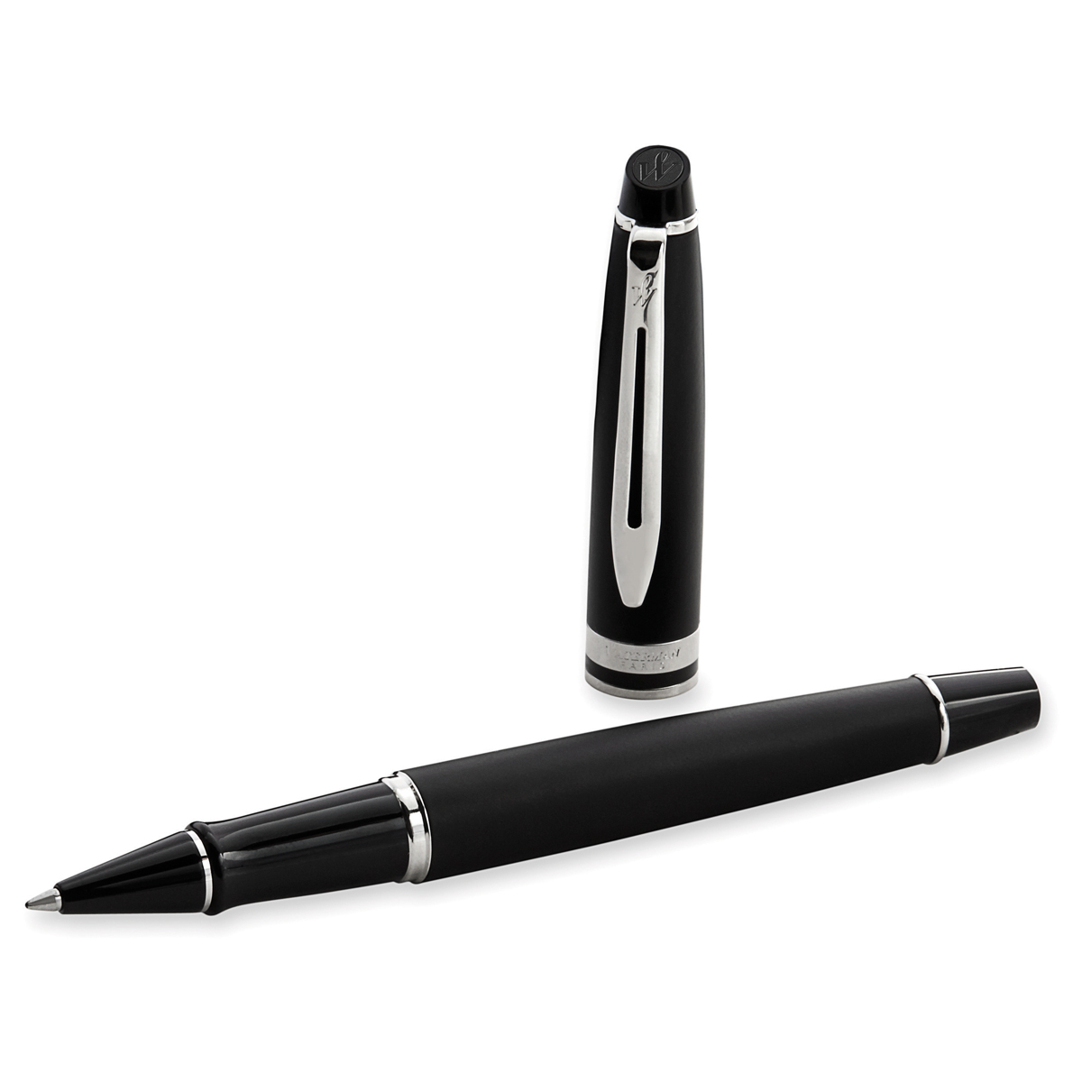 Ручка-роллер Waterman из коллекции Expert выполнена из латуни и покрыта лаком чёрного цвета. Декоративные элементы отделаны палладием. Ручка упакована в оригинальную премиальную подарочную коробку Waterman c откидной крышкой. В комплекте идет стержень роллер черного цвета, он находится под платформой с ручкой.