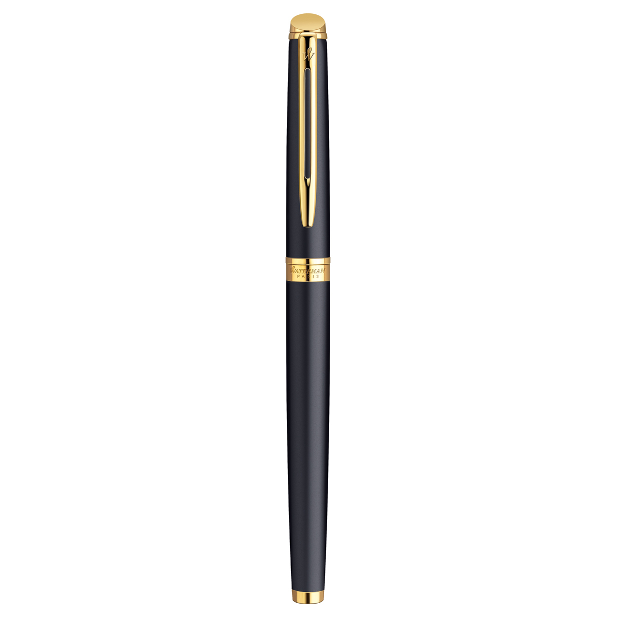 Ручка-роллер ручка Waterman из коллекции Hemisphere выполнена из латуни и покрыта лаком чёрного цвета. Декоративные элементы отделаны позолотой 23K. Ручка упакована в оригинальную премиальную подарочную коробку Waterman c откидной крышкой. В комплекте идет стержень роллер черного цвета, он находится под платформой с ручкой.